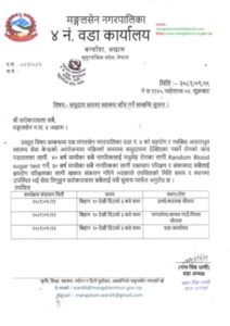 वडा कार्यालय मार्फत सूचना जारी गर्दै यहि पुस २१ गते देखि २३ गते सम्म ३ दिन वडाका विभिन्न टाेलमा स्वास्थ्य जाँच कार्यक्रम राखिएको छ । जसा २१ गते ढल्ले बडरुख चाैतारामा, २२ गते नागाताेला कमलगाउ पिपलचाैतारामा र २३ गते वडा कार्यालयमा स्वास्थ्य परिक्षण कार्यक्रम राखिएको आधारभूत स्वास्थ्य सेवा केन्द्रका ईञ्चार्ज अर्जुन बहादुर बाेहराले जानकारी दिनुभयाे ।