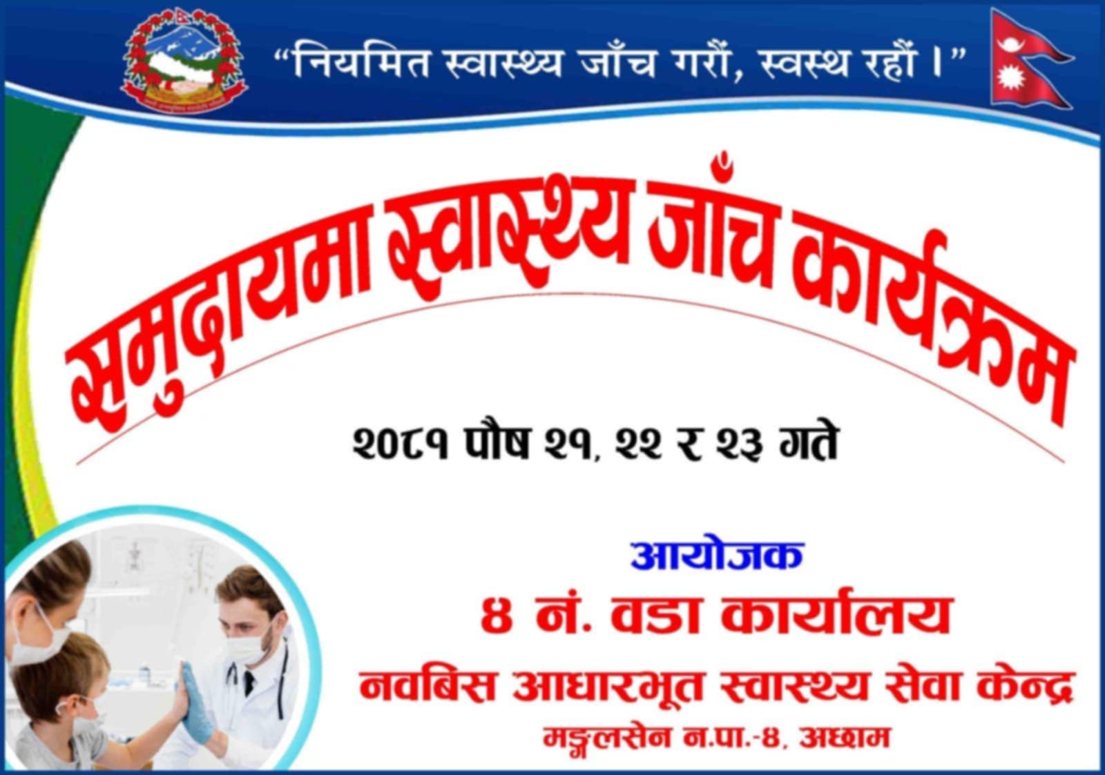 मङ्गलसेन नगरपालिका ४ मा समुदाय स्तरमै सवै नागरिकको निशुल्क स्वास्थ्य परिक्षण गरिने भएको छ । वडा कार्यालयकाे सहयोग तथा बलडाडा आधारभूत स्वास्थ्य सेवा केन्द्रकाे आयाेजनामा साे कार्य हुन लागेकाे हाे ।