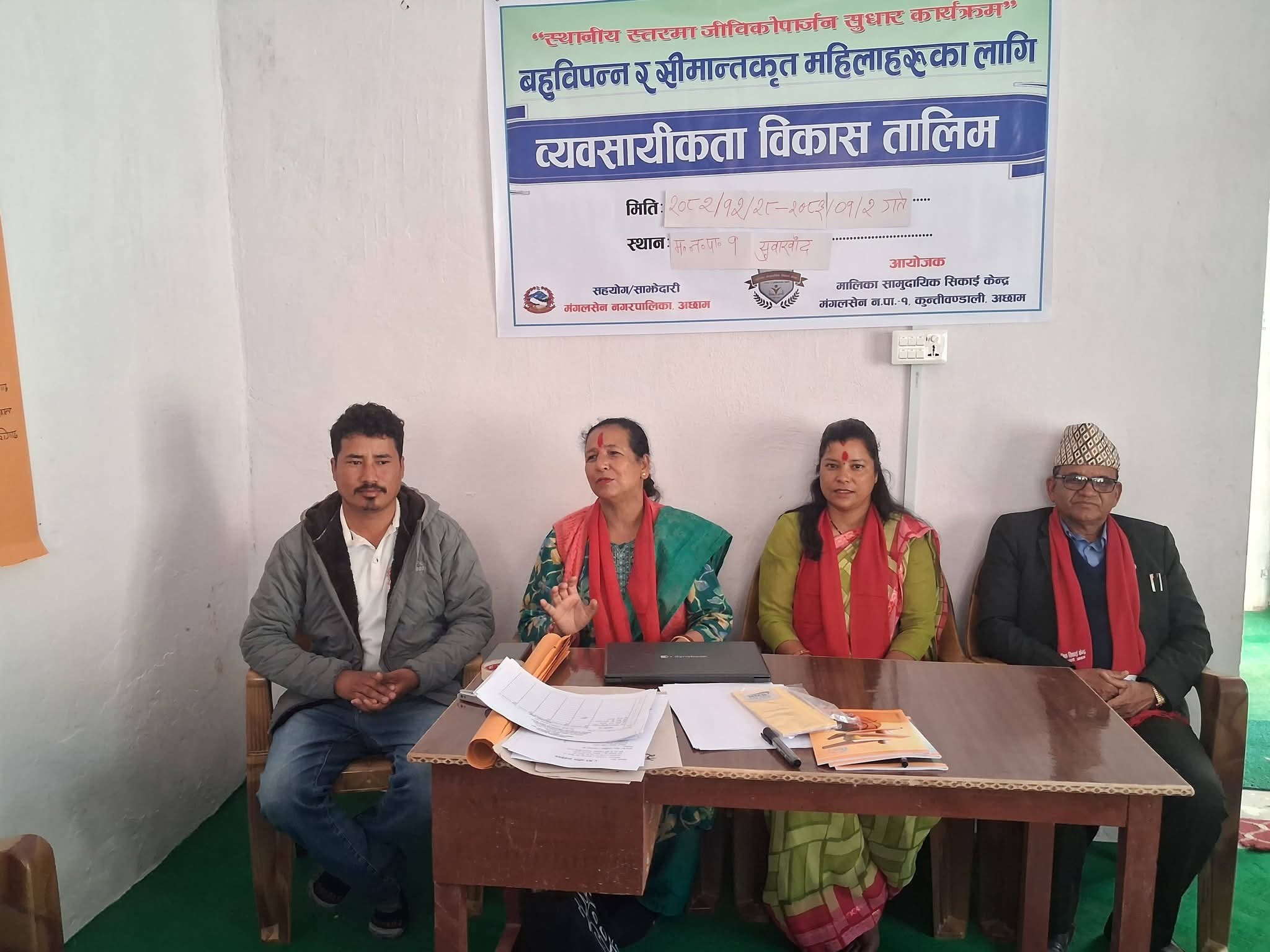 मंगलसेन नगरपालिका–१ मा बहुविपन्न तथा सीमान्तकृत महिलाहरूको आयआर्जन र सीप विकास गर्ने उद्देश्यले व्यवसायिकता विकास तालिम सञ्चालन गरिएको छ। मालिका सामुदायिक सिकाइ केन्द्रको आयोजना तथा मंगलसेन नगरपालिकाको सहयोग र साझेदारीमा उक्त तालिम सुरु गरिएको हो।